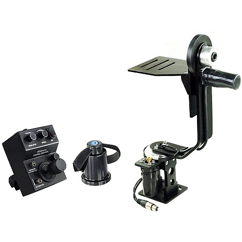 The Proaim Jr Pan/Tilt Head with Joystick Control Is a motorized pan/tilt remote head for jibs and cranes than runs on 12 VDC from either a battery pack or the included AC power supply. It can safely handle camera packages weighing up to 11 pounds, with 10 pounds being recommended, and it is capable of panning and tilting throughout 360° in each axis.