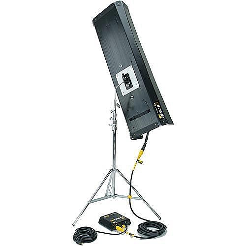 Foto-Flo 400 fixtures supply elegant lighting solutions for photo and video professionals who need the very best in cool light design. The solid-state high output ballast attaches directly to the fixture for ease of use while mounted on a light stand or hung from a studio grid. However, for location work the ballast can be removed to operate the four-lamp fixture remotely up to 75 feet away. The long soft source can be turned 360 degrees to shape light on a subject and erase shadows on the set. Cool and lightweight, the Foto-Flo 400 fixture can easily be hand-held or taped to a wall or ceiling for location interior work.