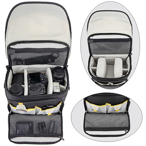 • Holds Pro DSLR, up to 4 Lenses, Flash
