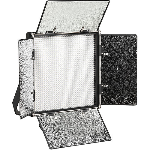 The fixture is DC powered, incorporating a 4-pin XLR connector and including an AC/DC power supply for mains power. Interchangeable Gold Mount/V-Mount plates are included so no worrying about getting the fixture that matches your battery system. The four-leaf barndoors provide control over light spill, and feature removable light intensifiers to suit your taste. The yoke is angled forward 30°, which allows you to open the barndoors all the way without hitting the yoke when the light is pointed straight forward. The fixture also has a combo baby pin/junior stud mount so you can mount it on a stand or hang it from a grid with optional clamps.