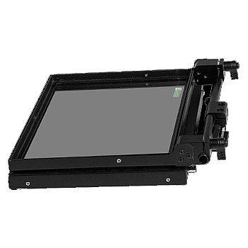 The glass frame folds right onto the monitor, allowing for easy transport, and in the same manner is adjustable up and down into the best viewing position for the presenter. A zippered hood with a fabric lens cover is included that secures firmly to the monitor frame. The quick release baseplate is height-adjustable to accommodate various cameras from small to mid-size.