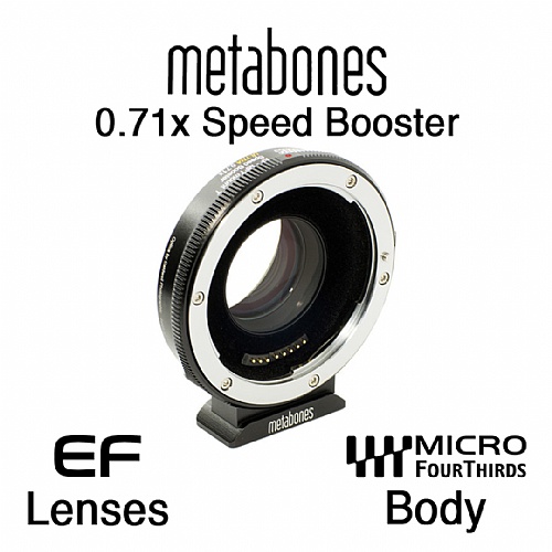 The T Speed Booster Ultra 0.71x Adapter for Canon Full-Frame EF-Mount Lens to Micro Four Thirds-Mount Camera from Metabones allows a full-frame Canon EF-mount lens to be mounted onto a Micro Four Thirds-mount camera. While doing so, the adapter's optics help to maximize the connected lens's apparent angle of view while providing a 1-stop increase for the camera over the lens's aperture range.