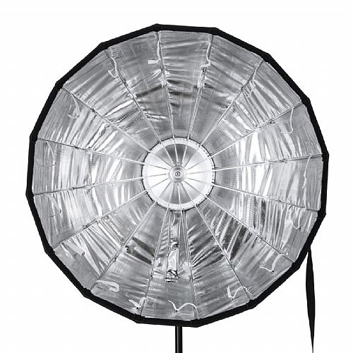 The unique beauty dish properties are achieved using a double reflector system that softens the flash properties twice. The final effect has qualities that cross between that of a direct flash and a softbox, giving the image a wraparound look - like a softbox, but with more contrast and a more dramatic directed beam. The white interior finish delivers a deliciously soft output, creates subtle distinction and reveals more detail of your subject. Intrinsic to the beauty dish design is a small opaque deflector cover that is suspended concave profile out, directly over the front of the light source, preventing direct light from hitting the subject. The light then bounces back off the inner curved deflector plate and floods the wall of the outer bowl of the beauty dish, resulting in a broad spread of softer indirect light. The effect is gentler than obtainable from a standard reflector and markedly less harsh than of a speedlight. By flipping the deflector plate and using it convex side out, you can realize differing levels of light distribution.