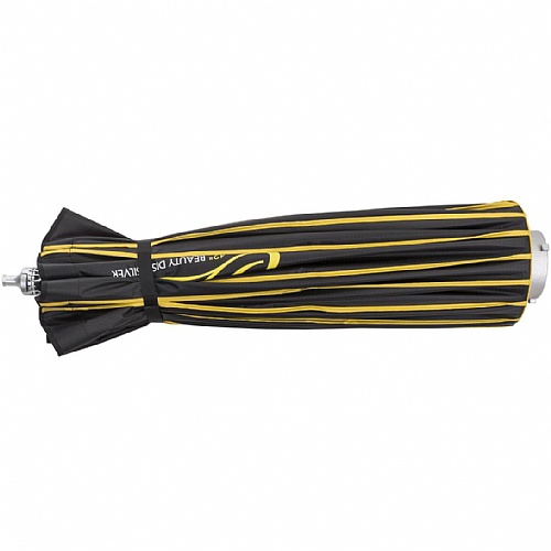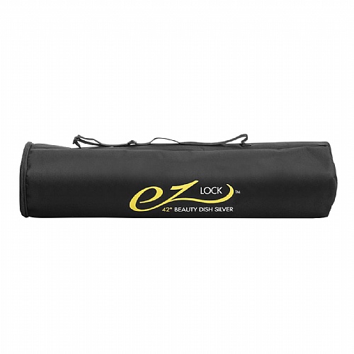GLOW EZ LOCK 42" SILVER BEAUTY DISH is an ingenious portable version of the light modifier famous for stunning fashion and portraiture images showcasing the incomparable safe and sure EZ Lock system. No more clumsy construction, fumbling with flex resistant rods or struggling in frustration for careful alignment of speedring holes. The 16 ribbed dish opens up and closes down, 'umbrella style.' The ingenious self-catch EZ Lock surrounds a thick center shaft, providing a comfortable place for your fingers topush-lock the mechanism open, and a generous wide button to unlock-release and close the beauty dish painlessly. The quick-to-setup quasi-parabola saucer like assembly has all the advantages of the beauty dish allure without the disadvantages of damage that a metallic dish confronts during location travel and is free of any of the drawbacks of a delicate bendable dish. This folding unit ismade for the road, however, with sturdy aluminum support rods for structural stability and extraordinary fabric strength.