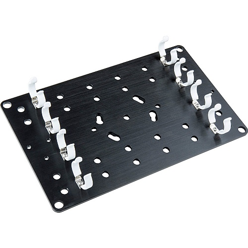Lightweight & black anodized aluminum made, the twist-lock mounting plate is equipped with four pairs of rubberized spring clips allowing it to mount 4 Kino Flo lamps or T12 lamps. The plate comes with 12 dia. 3/8in hole for connecting to the Kupo Off-Set Mounting Plate with Baby Receiver (KG400212), a cheese plate, or mounting V lock set for battery.